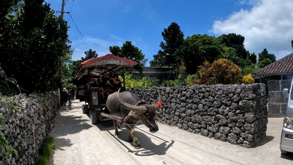 竹富の水牛車は、楽しいガイドと三線演奏。